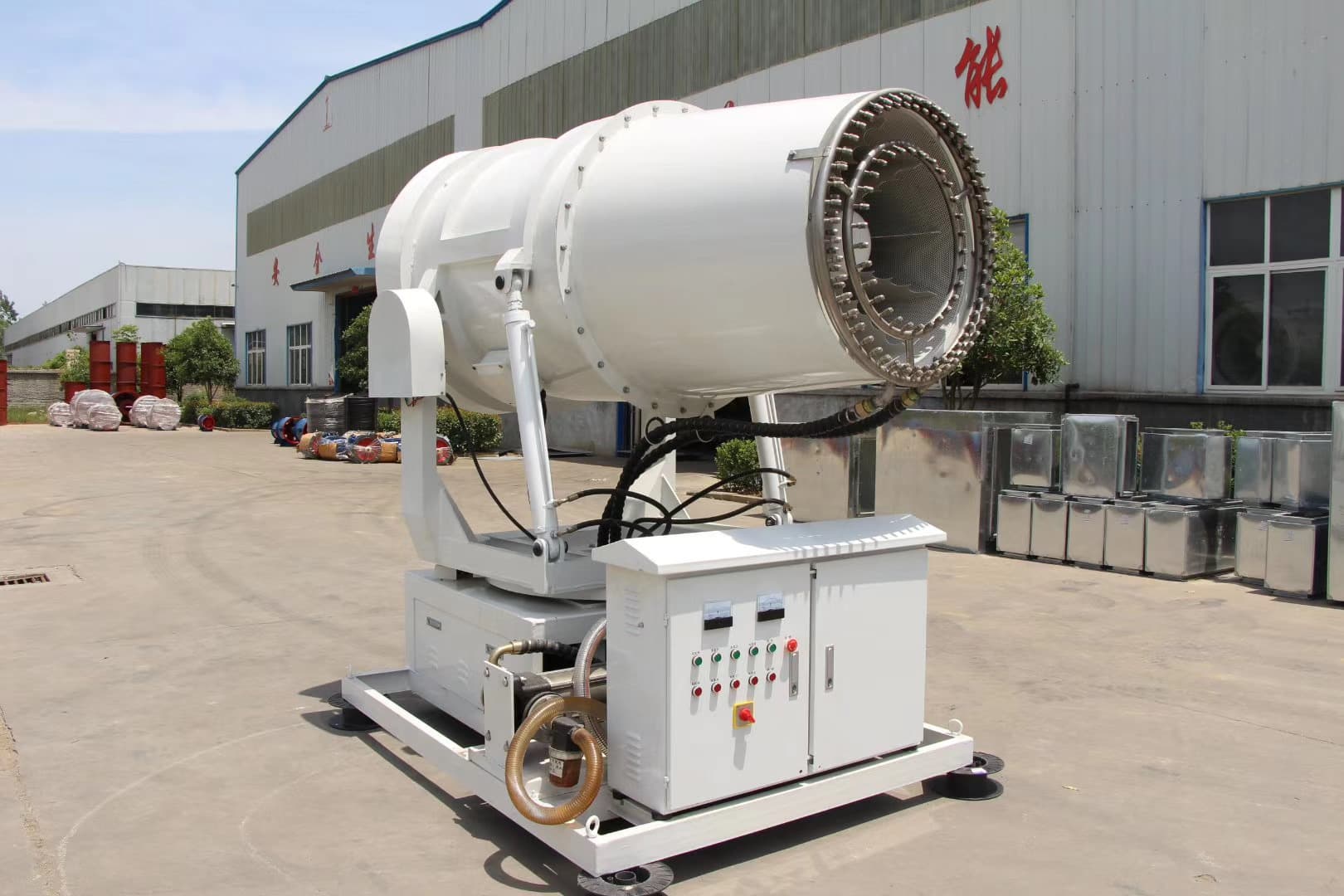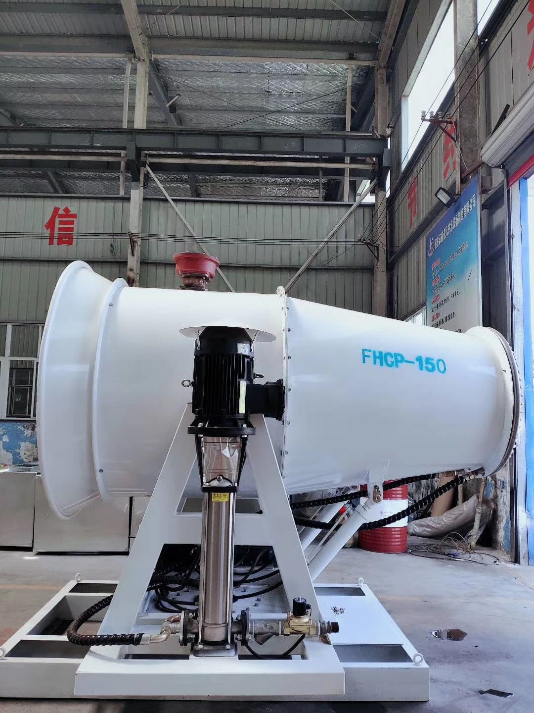 The 150m Throw Distance Split Type Fog Cannon Machine can directly use 380V mains power, or can use diesel generator set to provide power, whether it is placed on a concrete pouring platform or a mobile vehicle; it is simple to operate, through manual operation or remote control, at the level Angle or adjust the spray angle up and down, it is safe and reliable to use.
